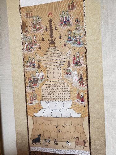 宝筐印陀羅尼塔の曼荼羅の修理が終わりました 下の方には犬、馬、猿や牛、蛇やニワトリなどの禽獣や小鳥や昆虫なども集まっています。この陀羅尼を納めた塔の影になるだけでアリや蛾のようなものまで解脱を得るという。彼らはそのことをものがったているので…
